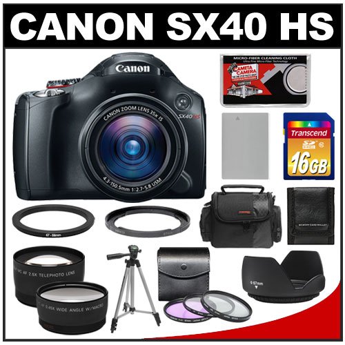 - Canon PowerShot SX40 HS Digital Camera (Black) with 16GB Card + Case + Battery + Tripod + Telephoto & Wide-Angle Lenses + Accessory Kit